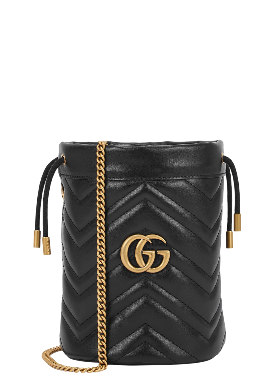 Bolsa Gucci GG Marmont Bucket Mini Preta, confeccionada em couro ecológico com acabamento matelassê e ferragens douradas com acabamento oxidado, o modelo bucket possui alça longa em corrente, tag GG metálica frontal, fechamento por tiras com ajuste, compartimento interno único, dois compartimentos para cartão e mosquetão dourado.