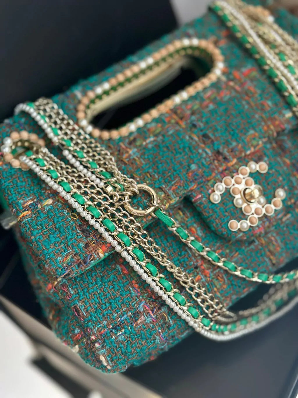 Esta grande aba dupla vem em um tweed verde e tem ferragens douradas embelezadas. A aba frontal apresenta o fecho CC turnlock exclusivo que é embelezado com pérolas e contas. A corrente é composta de pérolas, elos de corrente em tom dourado e um elo de corrente de couro verde entrelaçado . A parte superior da bolsa tem uma alça recortada que é cercada por pérolas e contas de madeira.