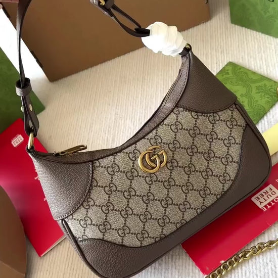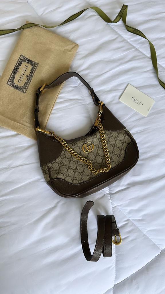 Esta nova pequena bolsa tiracolo em forma de meia-lua foi inspirada nos arquivos da Maison, é confeccionada em couro macio e apresenta o emblema Double G – um código originalmente introduzido na década de 1970. Incorporando a noção de versatilidade, a bolsa é enriquecida com duas alças, uma feita em couro e a outra com o reconhecível design de corrente em tom dourado.