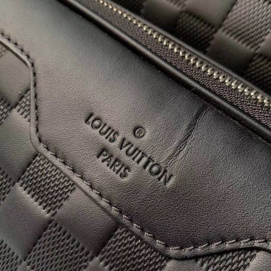 Mochila LV Campus prática em couro preto com estampa xadrez, ferragens em metal prateado, alça simples em couro preto, duas alças em couro preto permitindo que a bolsa seja usada na mão ou nas costas.