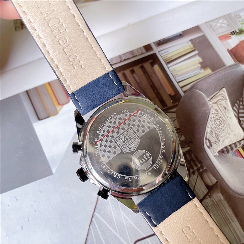 Apresentando as mesmas cores do carro de Steve McQueen no clássico filme de 1971, Les Mans, o mostrador azul-escuro escovado do Gulf chama a atenção com as listras laranja e azul do Gulf, enquanto a ampla caixa de aço de 43 mm garante facilidade de leitura na estrada.