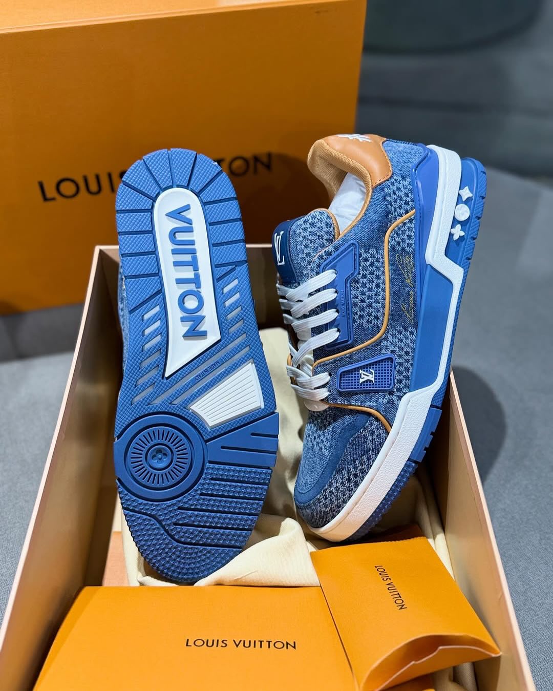 Esta versão do tênis LV Trainer é confeccionada em jeans Damier 3D. Combinando com os artigos em couro e ready-to-wear, este modelo possui acabamento em couro natural.
